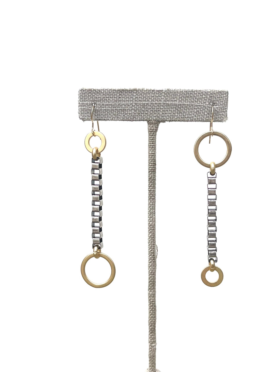 Presenting Dylan, a captivating pair of earrings from LJ Sonder. These earrings feature a sophisticated box chain design with elegant circle drops, providing a distinctive blend of contemporary and classic aesthetics.