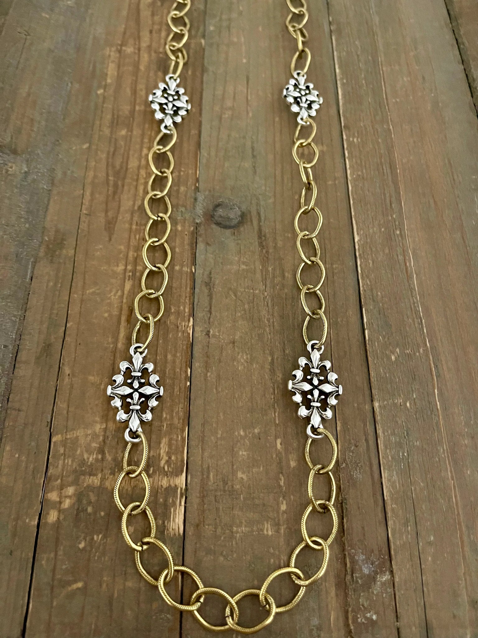 Mixed Metal Sterling & Gold Plated 36" Chain with Vintage Reproduction Fleur De Lis Accents