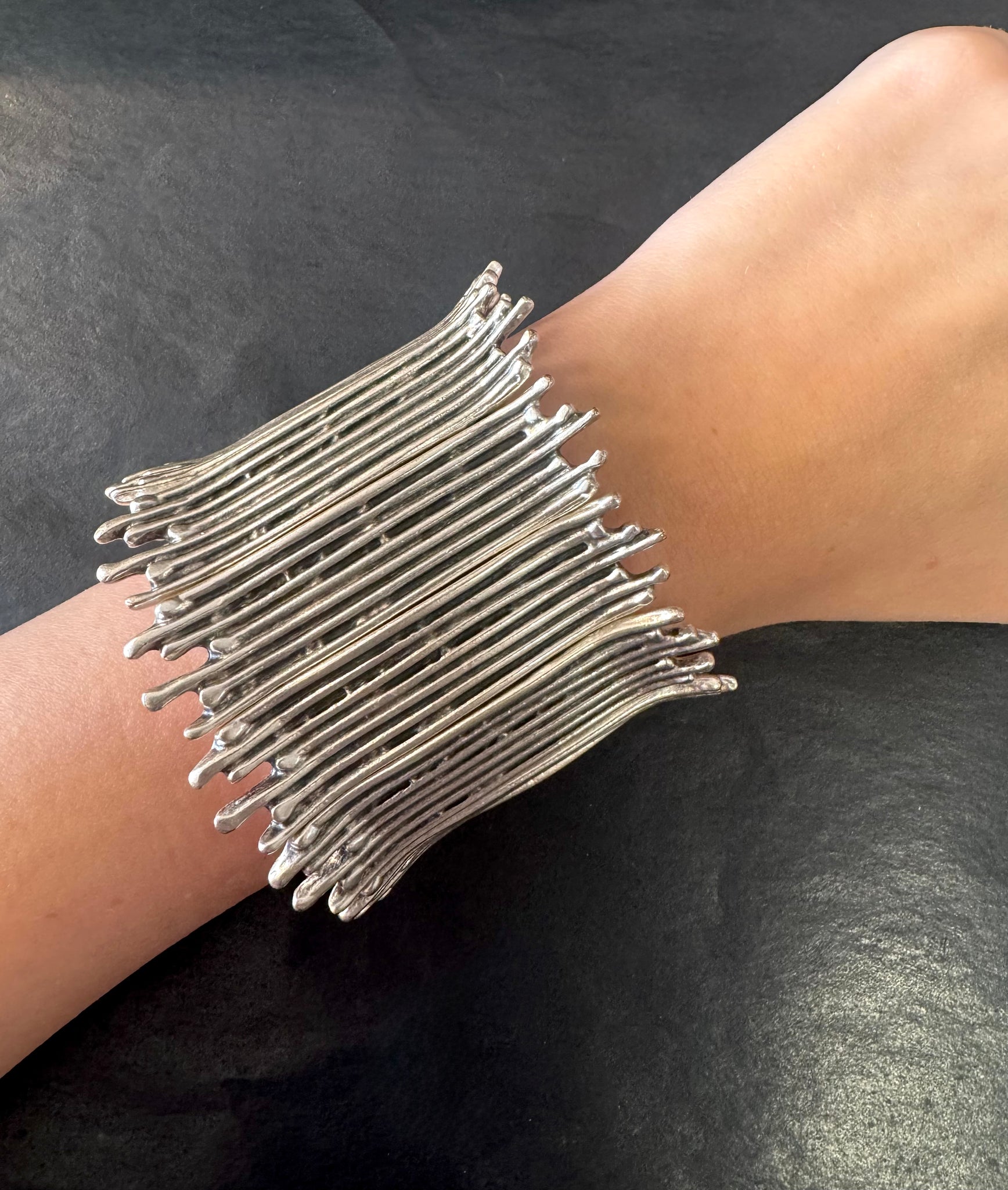 Add a bold edge to your look with this playful Spiky Cuff. Its textured silver finish catches the light, while the stretchy, adjustable design ensures a comfortable fit for any wrist. Perfect for those who love a little attitude in their accessories!