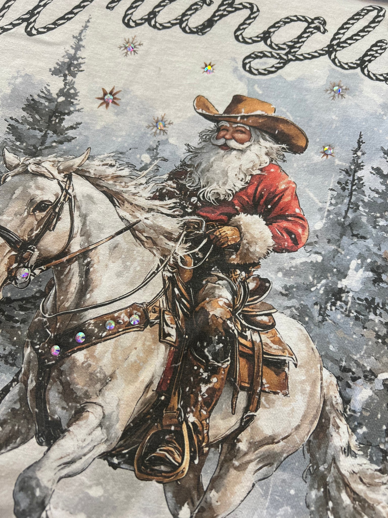 Get ready to sleigh the holiday season with our Wrangling Christmas Cheer Shirt! Featuring a cowboy Santa sparkling with festive bling, this playful design brings a fun Western twist to your Christmas wardrobe. Perfect for spreading cheer with a wink and a nod, it’s a great way to celebrate the holidays in style and comfort. Yeehaw and Merry Christmas!